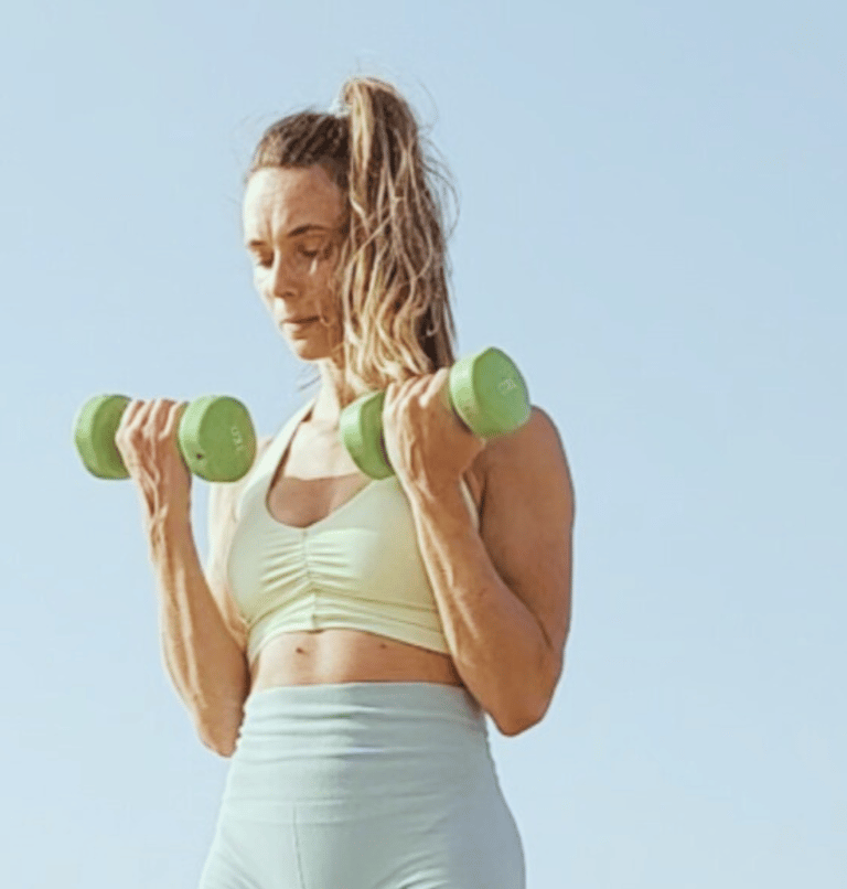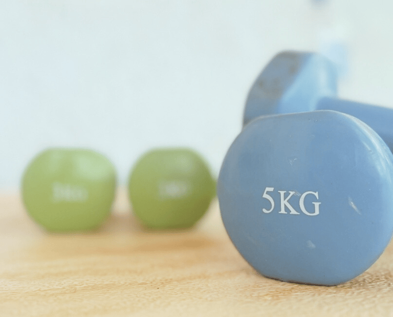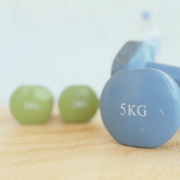 Svorių. Aš naudoju 3 ir 5 kg hantelius, bet visuomet svorį žiūrėkite pagal savo fizines galimybes. Galima pradėti sportuoti ir su vandens buteliais vietoj svorių.